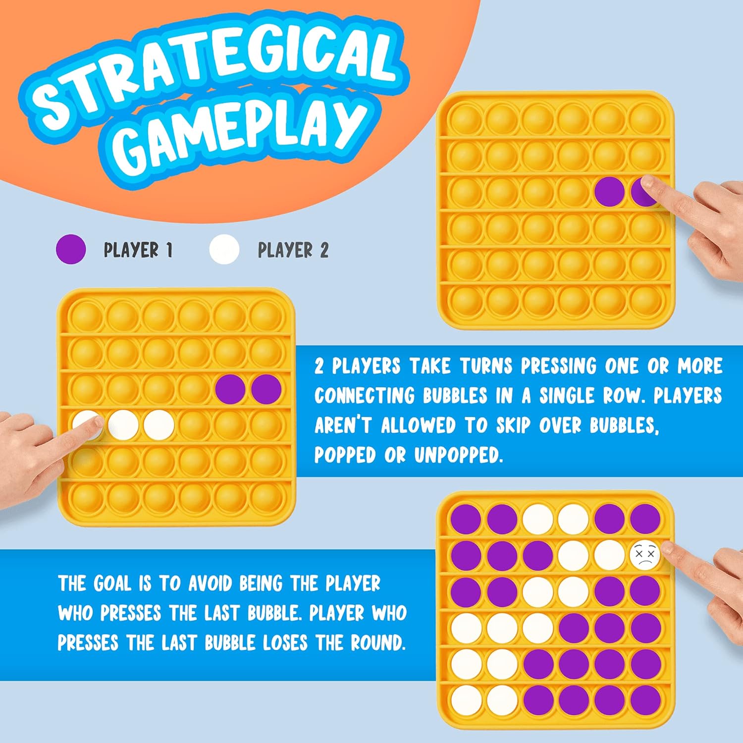 - STRATEGICAL GAMEPLAY: 2 players take turns pressing one or more bubbles in a single row. Players aren't allowed to skip over bubbles popped or unpopped. The goal is to avoid being the player who presses the last bubbles.