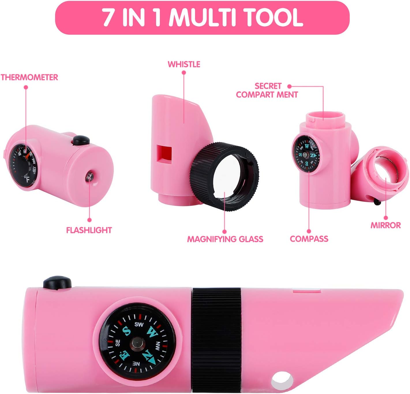 - Complete Kids Adventure Kit - Full Kids Exploration and Adventure Set includes Safari Cargo Vest x1, Safari Hat x1, Binocular x1, Kids Backyard Bugs Book x1, Telescopic Butterfly Net x1, Magnifying Glass x1, 7 IN 1 Multi Tool x1(which contains flashlight, thermometer, compass, whistle, magnifying glass, mirror and secret compartment), Bug Collector with Magnifier x1, Tweezer x1, Bug Tong x1, Organization backpack x1.