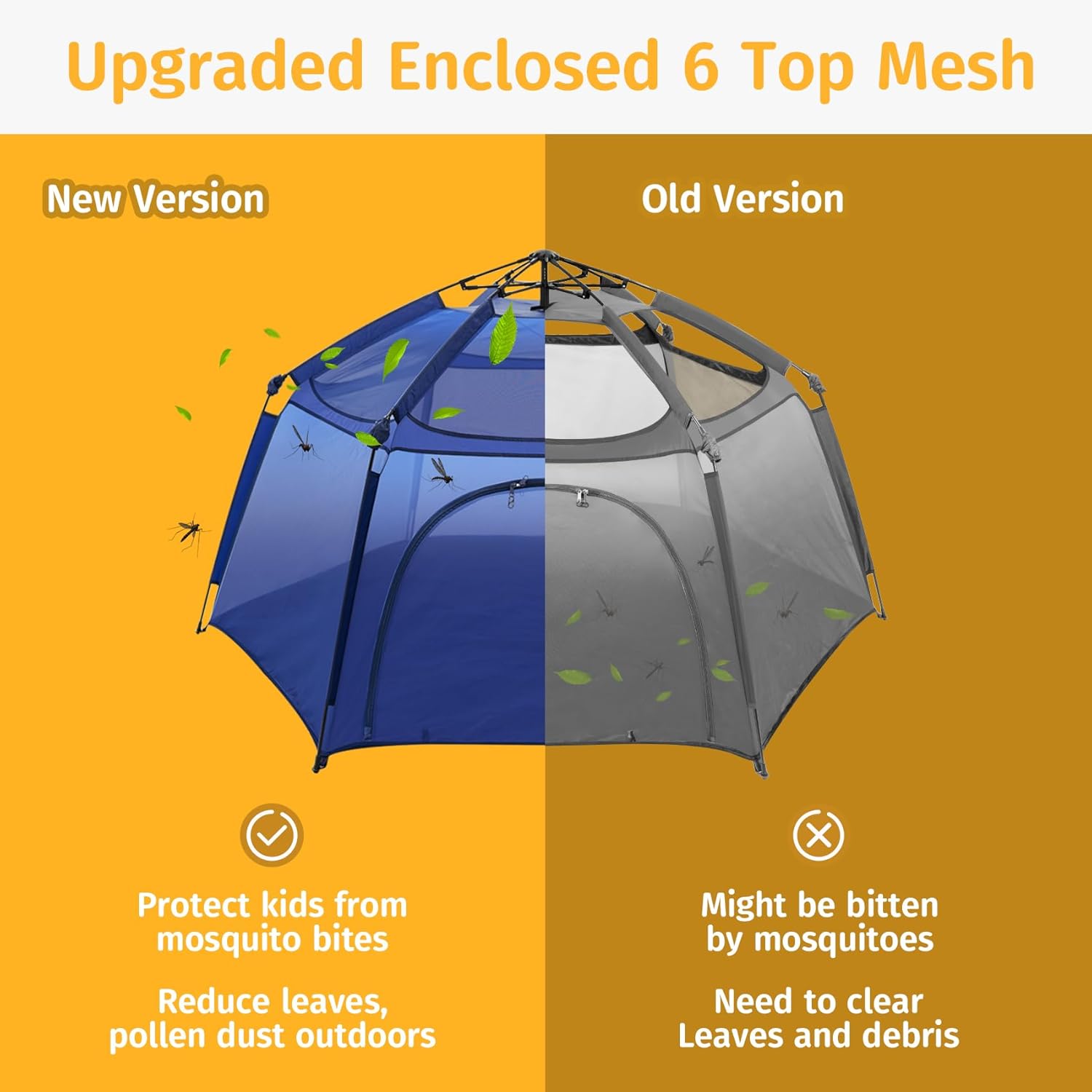 - ♫Upgraded new version: the new version is made of mesh for the whole tent body, the top part is fully enclosed by mesh as well! It can protect your little ones from mosquitoes and other insects, also provide excellent air ventilation for your kids. It comes with a removable fabric top cover, SPF UV 50+, to protect your kids from burning sun while in outside.