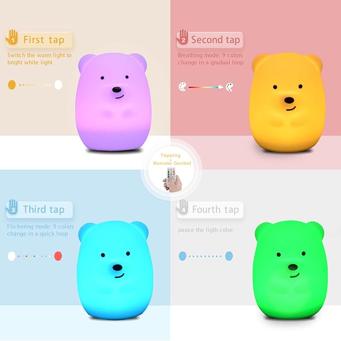 - ❤ Multifunctional Bear Night Light:Our cute night light has 9 soft light colors: red, green, blue,light blue, yellow, purple, orange,white and pink,changed by tappping. The brightness of kids night light afootry can be adjusted with the attached remote control to find the most suitable brightness for your eyes. 3 working modes from the bear lamp are available:monochrome,breathing mode-colors change in a gradual loop,and flickering mode-colors change in a quick loop,meeting your daily needs.