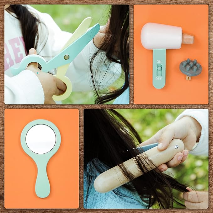 - 💇♀ 18 PIECE Realistic Barber Kit : Wooden Barber playset accessories include a Hair dryer, hairdressing watering can, hair clipper, perm stick, beard foam, hair scissors, razor, mirror, comb, sponge brush, hair brush, hair dye brush, hairdressing knife, bib, belt bag