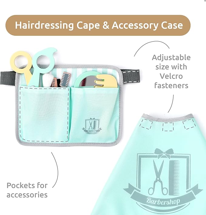 - ✂ HIGH QUALITY & DECORATION : The hair dryer is so real that you can actually dry hair, belt bag connects different parts which made easy to play, It has removable bib, the scissors mirror has a way for child to exercise hands-on ability, so your children can role play like a real barber