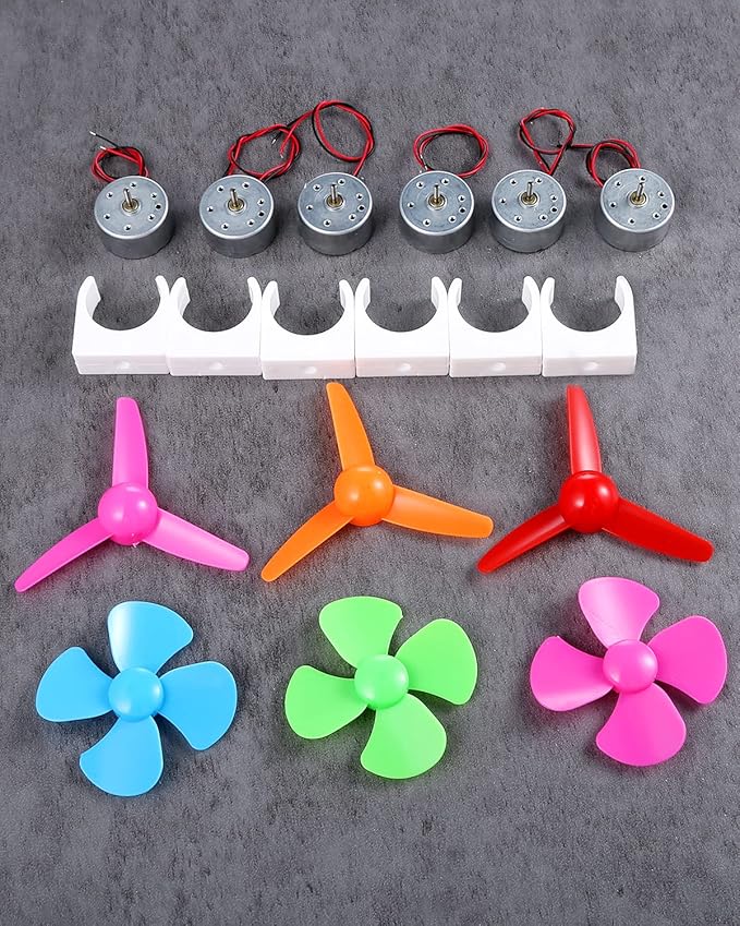 - Designed Beginner Kit: 6 PCS mini dc motor, 6 PCS Motor Mounting Bracket Holder and 3 PCS different colors 4 Vanes shaft propellers and 3 PCS 3 Vanes shaft propellers