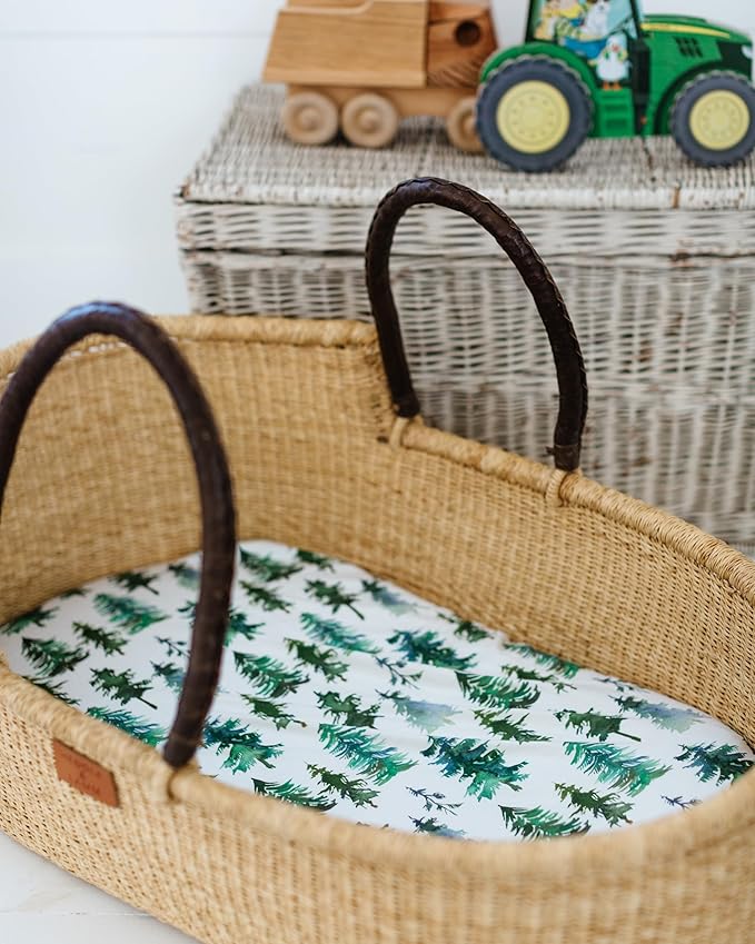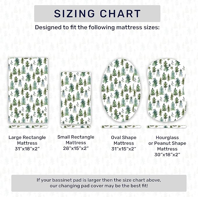 - 🌲 BEAUTIFUL DESIGN, UNBELIEVABLY SOFT MATERIAL – This beautiful custom pattern is printed on the most luxuriously premium organic cotton blend. Thicker elastic and deeper pockets ensure that our bassinet mattress sheets will NOT slip off the mattress pad. You’ll feel the soft, yet stretchy and silky material as you pull the sheets and snug, creating a safe and soothing space for your baby to sleep.