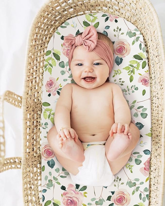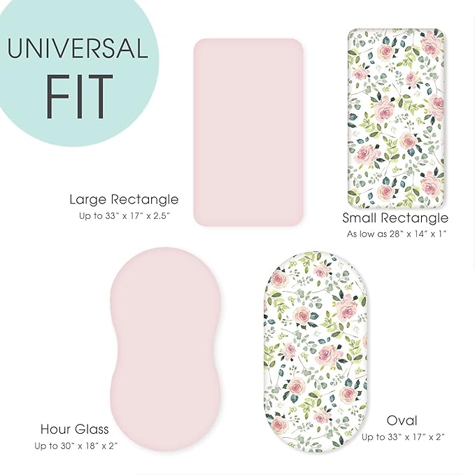 GRSSDER Stretchy Ultra Soft Baby Fitted Bassinet Sheet Set 2 Pack, Universal Cradle for Rectangle, Oval, or Hourglass Pad/Mattress, Pink Rose Sheets Girls