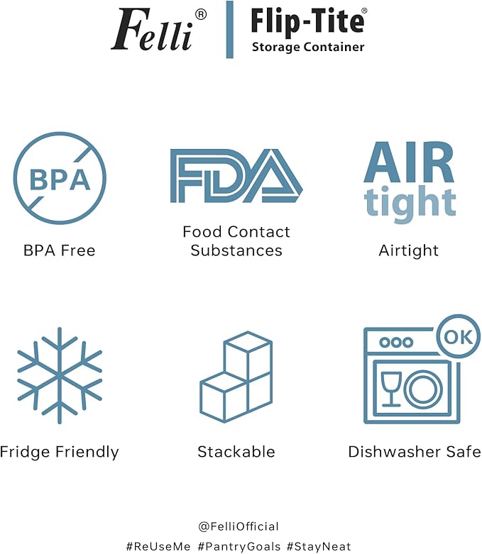 - AIRTIGHT SILICONE SEAL: Felli Flip Tite containers have a patented flip lock lid that creates an airtight seal, keeping food dry & fresh for longer food shelf life. It’s also an Eco-friendly alternative to disposable options and can reduce waste and save you money in the long run.