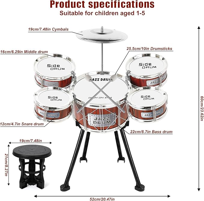 - [Toddler Drum Set] Kids drum set comes with 5 drums (1* 8.7" x 4.9" big drum, 2* 6.3" x 2.6" middle drum, 2* 4.7" x 2.2" little drum), 1 stool, 1 cymbal, 2 drumsticks, the assembled drum set is about 23.6" high, specially designed for toddler aged 1- 4 years old. The upgraded tip-resistant 4-leg base ensure worry-free play.