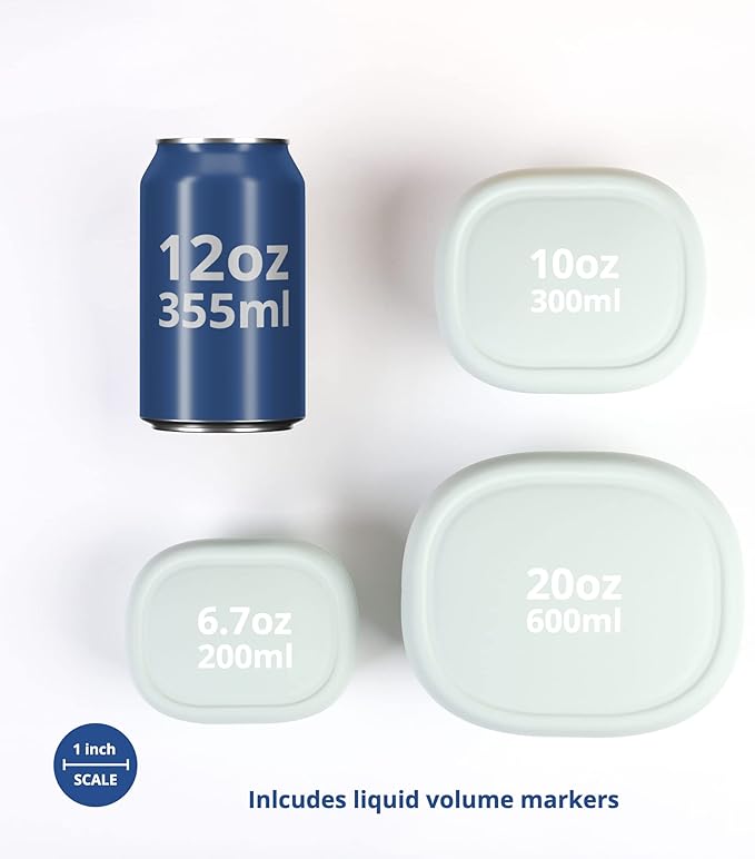 - Versatile and Durable - Our silicone food containers are ideal for storing lunch, leftovers, baby food, cheese, and snacks. They have liquid volume markers, are temperature resistant (-40°F - 482°F), microwave friendly, lightweight, unbreakable, easy to clean, and reusable.