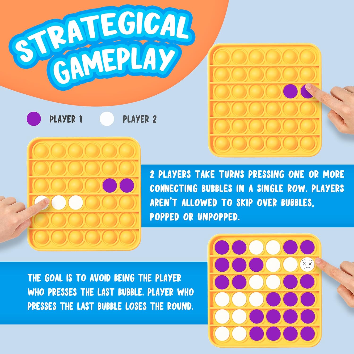 - STRATEGICAL GAMEPLAY: 2 players take turns pressing one or more bubbles in a single row. Players aren't allowed to press adjacent bubbles within the row selected. The goal is to avoid being the player who presses the last bubbles.