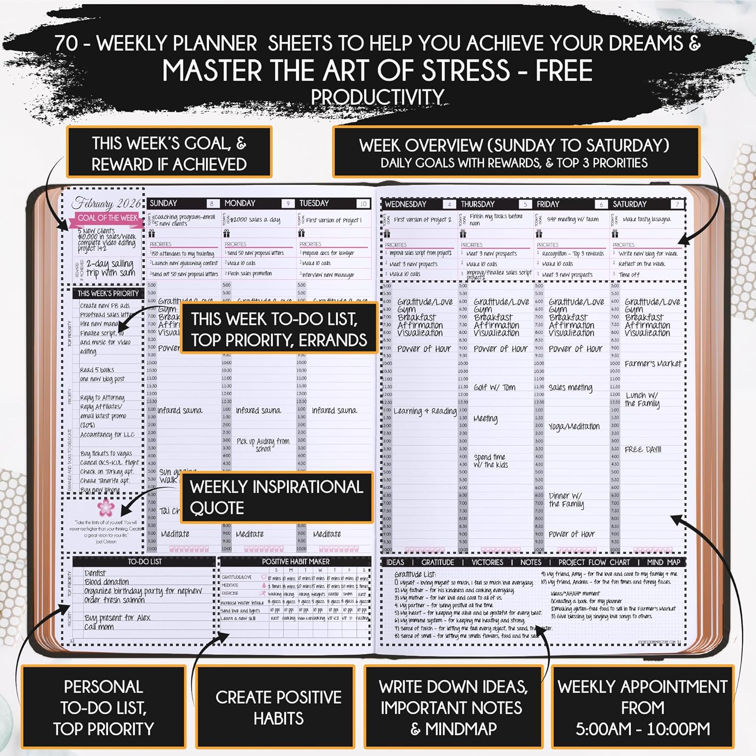 - WEEKLY PLANNER 2025-2026 - Increase your productivity and happiness. This is a deluxe life goal planner showing you how to become the best possible version of yourself on a mental, physical & interpersonal level using the law of attraction vibration guide. The weekly and monthly planner is also a daily, productivity, goal, business planner, to do list planner, notebook & gratitude journal all-in-one.