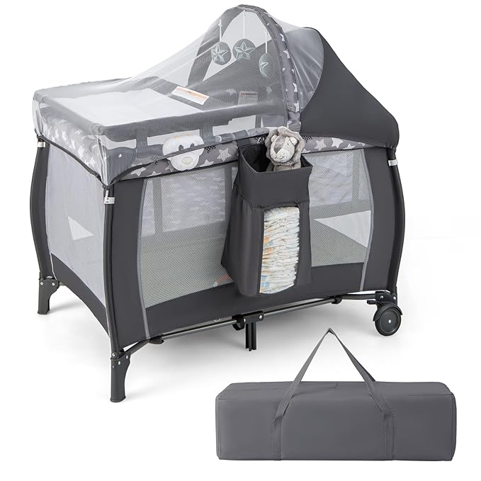 HONEY JOY Pack and Play with Bassinet, 4-in-1 Portable Baby Playard with Changing Table, Net & Cute Toys, Diaper Storage Bag, Music Box, Wheels with Brake, Foldable Newborn Play Yard w/Carry Bag