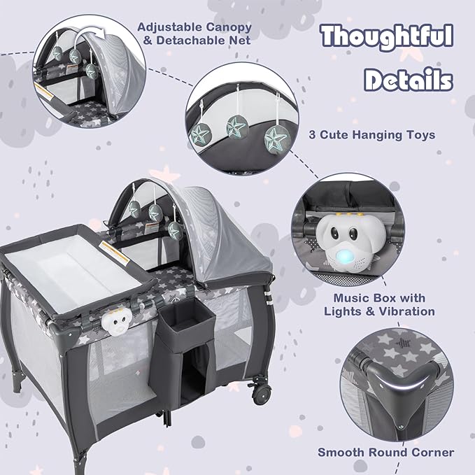 - 【Safe & Comfortable Pack and Play】: Equipped with sturdy supporting structure on the bottom, this nursery center brings more stability to support your baby standing. Furthermore, the round edge design is safe for baby to touch.