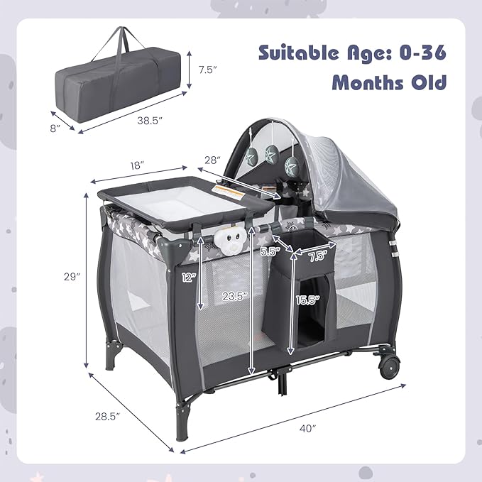 - 【Considerate Design】: With hanging toys and music player, this nursery center can be transformed into a play yard so that your baby is no longer bored when lying down. In addition, the diaper storage organizer is convenient for parents to get diapers within reach.