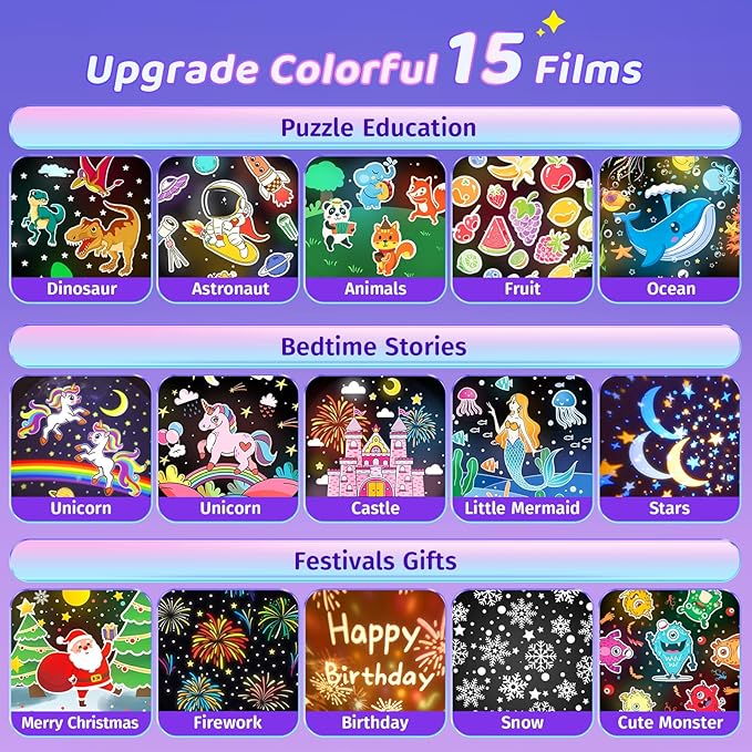 - 【Ideal Night Light for Kids Companion】①Equipped with 15 films and 180 lighting modes, making the kids night light projector more vibrant for kids’ rooms;②Built-in HIFI 5.0 Bluetooth Speaker, plays soothing music or white noise to help kids fall asleep easily;③Comes with a remote control—conveniently adjust colors, music, volume, timer, brightness and rotation;④Rechargeable design, no need to buy extra batteries. Take this kids night light projector anywhere; it adds color to life and greatly aids sleep! Package includes realistic large moon, various stars, astronauts, planets, unicorns and more. The night light projector dresses up walls, ceilings and other spaces effortlessly.