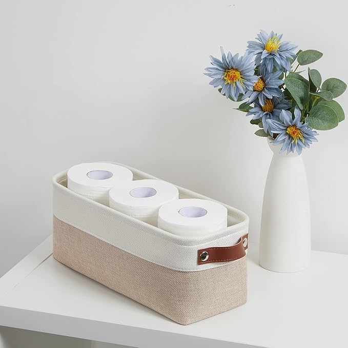 - 【Unique Design & Modern & Decorative】Set of 2 small toilet paper baskets, dimensions(each): 15(L) x 6(W) x 5.5(H) inches. Fabric storage baskets bring you organizing convenience and a sweet home. Great for socks, underwear, books, magazines, toys, pet products, wipes, towels, decorations, office supplies, DVDs, and gifts. The fabric baskets with neutral colors can match a lot of home styles - keeping your home nice and tidy.