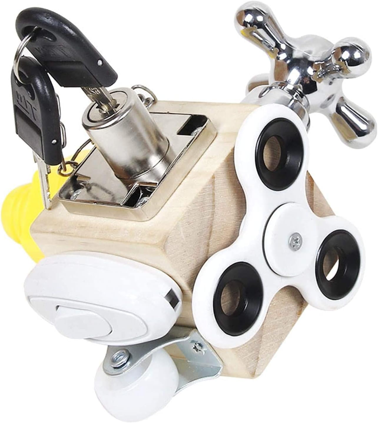 - 7 different activities: 1. A scale tap that can be rotated. 2. Key lock with 2 attached keys. 3. A very popular toy for stress relief 4. The light switch clicks audible when pressed. 5. A free rotating wheel. 6. Spring latch: press the pin until it clicks into place and releases with a button. 7. Nut can be screwed on and off to the screw.