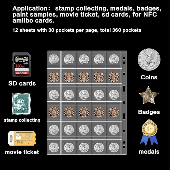 - Clever Pocket Design of Coin Collection Book Folder Page: Coin books album holders pocket pages not only you can store coin silver dollars, but also for stamp collecting, medals, badges, paint samples, movie ticket, sd cards, for NFC amiibo cards. Each coin pocket has a flap on the back, prevent coin from falling out and sliding around. Separate pocket design to prevent coins from colliding and scratching against each other, Easy to insert coins supplies, keep them held in place.