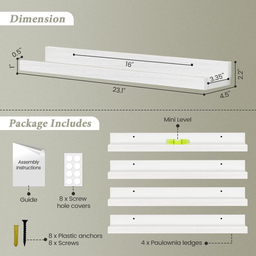 - 【Perfect solution for your walls】The floating shelves for wall & picture ledge shelf is SAME SIZE as each other (L 23.1" x D 4.5" x H 2.2") and is such an easy way to display photos without making lots of holes in your walls. The nursery book shelves are crafted from Paulownia wood which are lightweight yet proportionately strong, sustainable real wood. They come fully assembled and all mounting hardware is included in the package. Sturdy enough to hold up to 20 lbs with proper installation.