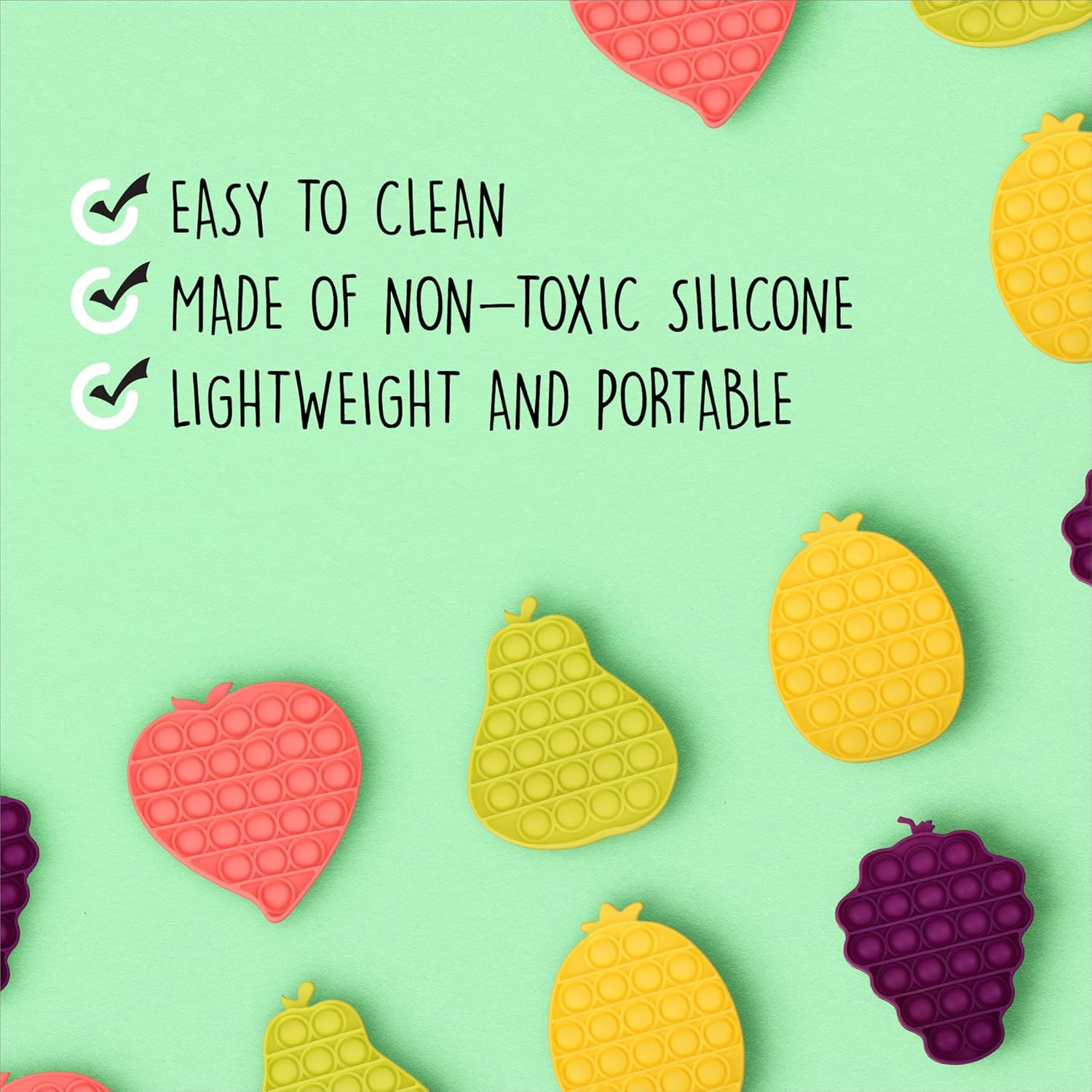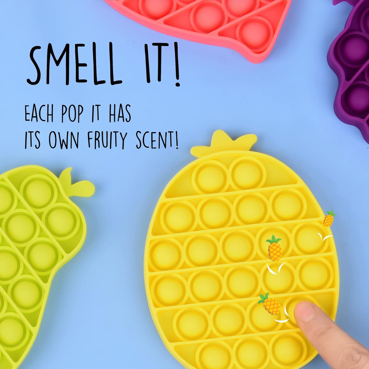 - Smell the Fruity Fun – Unlike other sensory fidget toys, our bubble fidget pop it allows you to indulge in sweet-smelling fruits that help you calm down. Smelling the colorful fruity aromas of pineapple, pear, strawberry, and grape will help melt away all of that built-up tension & stress
