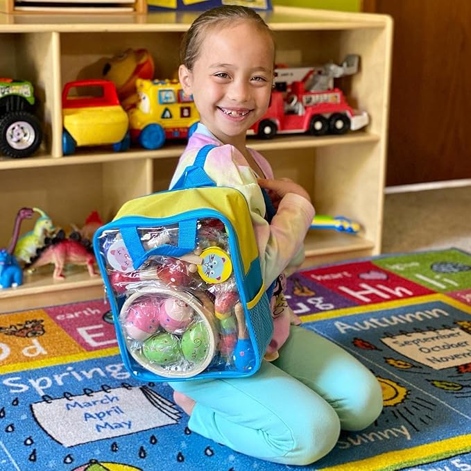 - 🎒[Toddler Musical Instruments Set] - 32 Pcs wooden percussion instruments toys including 4* shaker eggs, 3 in 1 xylophone, 3 in 1 wood sounder, 2* rattle drum, 2* handle sleigh bell, 2* maracas, 2* castanet, 2* smile whistle, 2* wrist bell, 1* bird whistle, 1* tambourine, 1* double head maracas, 1* rain column, 1* triangle bell, 1* wooden caterpillar, 1* rainbow bell stick, 1* speaker, 1* face bell, 1* backpack.