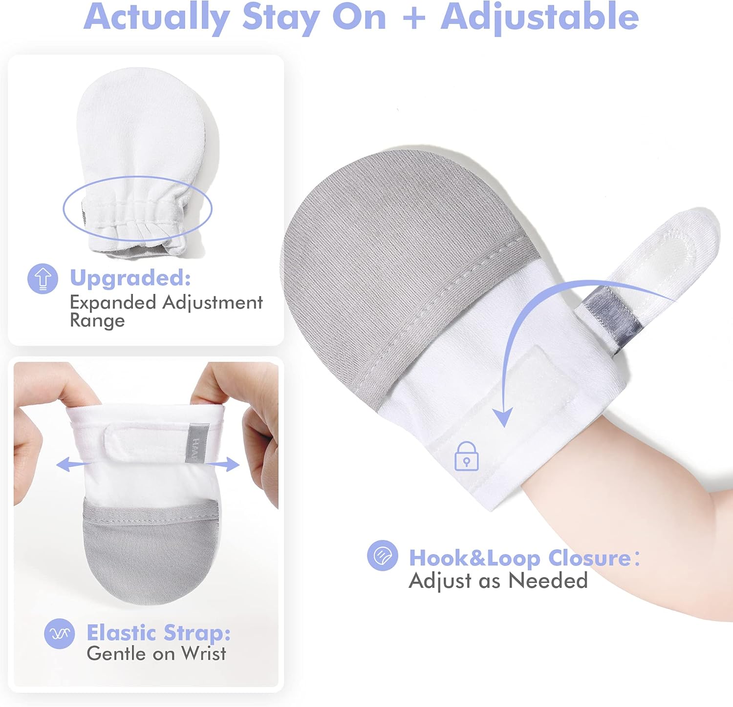 HAPIU Baby No Scratch Mittens Stay On, 100% Cotton Breathable, Adjustable Infant Gloves for Boys Girls, Newborn - 12 M