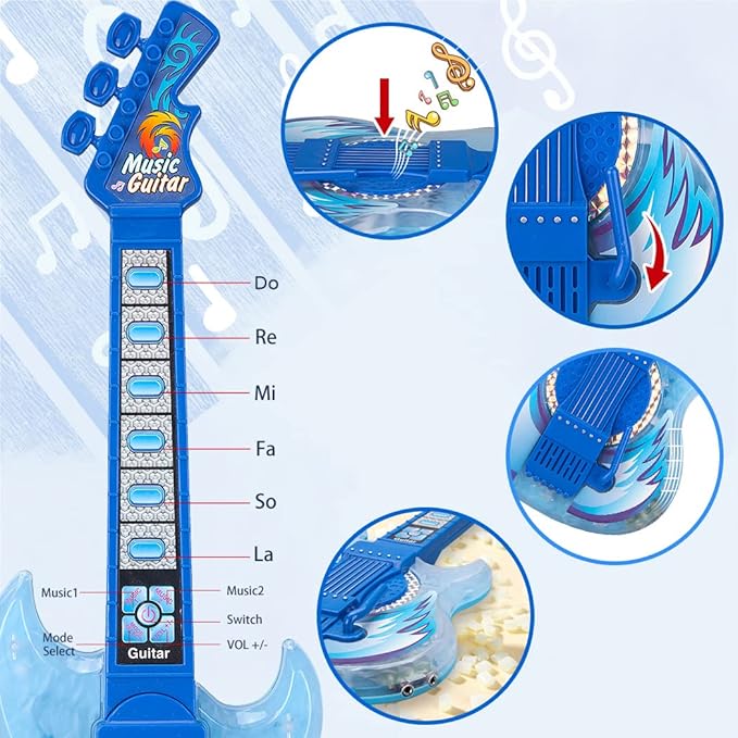 - Multifunction Music Toy:Guitar toy is with 6 music button and 4 function button.Child can enjoy various songs or press the note keys to create their own songs.Equipped with volume control (3 levels).Can be connected to mobile phones/MP3 to play child's favorite songs.