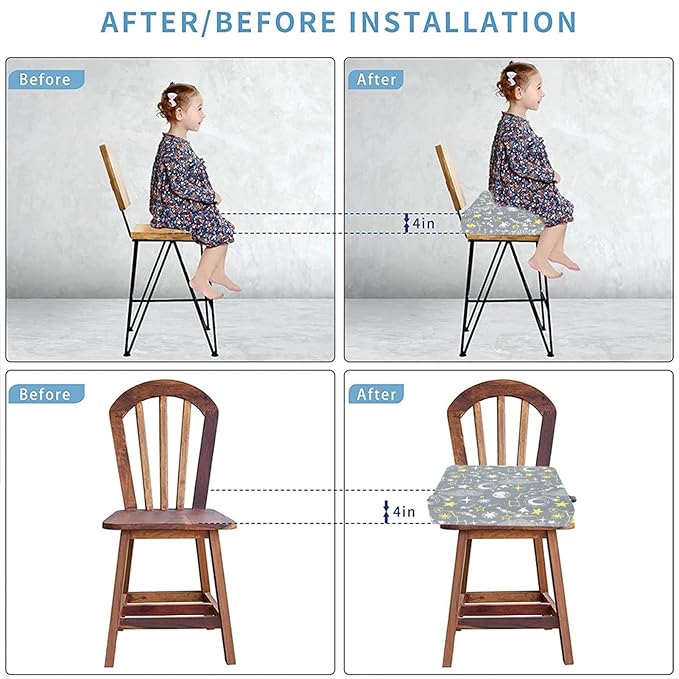 - 🟢Safety and Installation - There are two adjustable belts on the cushions, suitable for different sizes of chairs, stools, or platforms, you need to fix the seat belt buckle on the back and bottom of the chair to ensure the cushion It will not slip, ensuring the safety of children when eating.