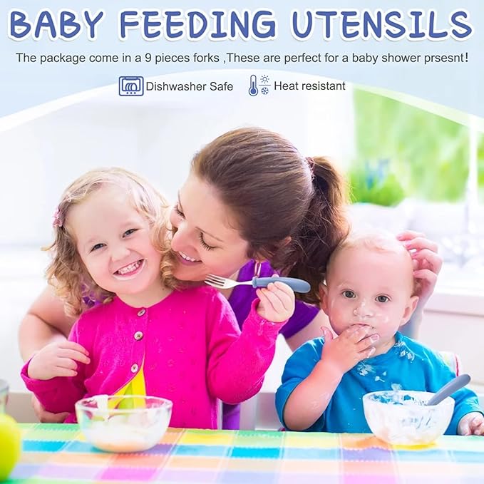 Chumia 9 Pieces Stainless Steel Toddler Forks, Kids Safe Utensils Set Baby Kids Self Feeding Training Cutlery with Round Handle, Stainless Steel Metal Flatware for Children Boys Girls, Dishwasher Safe