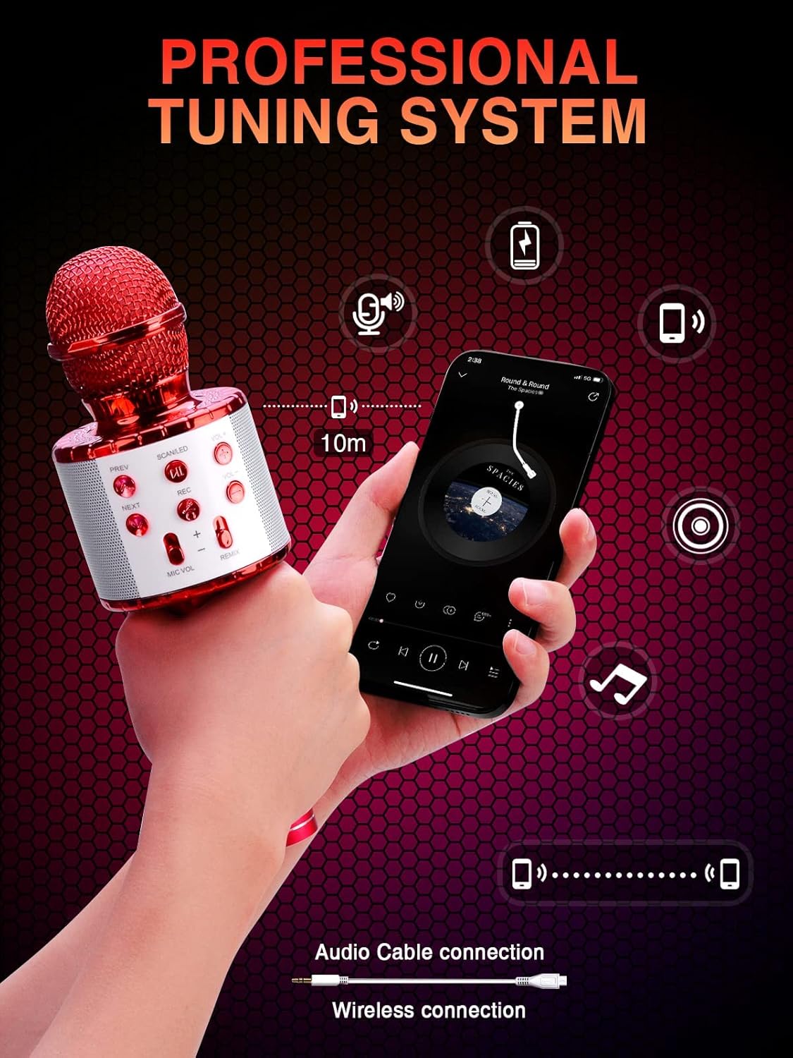 - ♫【Two Way Connection】3.5mm audio jack and connection, the wireless karaoke microphones can connect with all devices including Android iOS smart-phones, PC, laptops and APP such as YOUTUBE etc. connection has a great distance of 10m without obstacle.