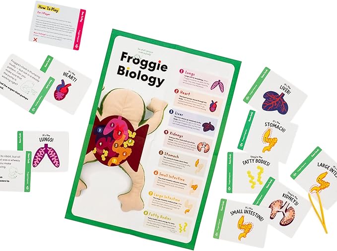 - Hands-on Learning: Play a diagnosis game to figure out why Froggie isn’t feeling well. Pick a card that describes a symptom and figure out which organ is having trouble. Then open up Froggie to operate on the organ and help Froggie feel better!
