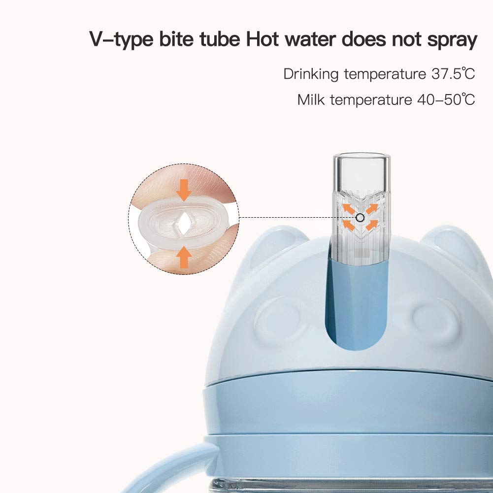 - LEAK-PROOF: V-type bite tube, features a leak-proof cover, baby can drink easily without choking. Recommended the maximum temperature is below 109℃. (Drinking temperature is suitable for 37.5℃; Milk temperature is suitable for 40-50℃).