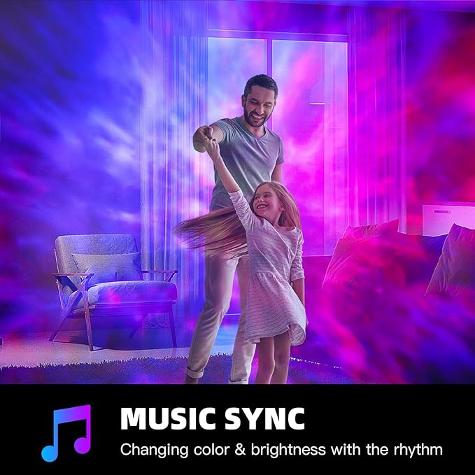 - [Music Sync & DlY Modes】 The smart star projector will synchronize with themusic collected by the microphone, with 6 music modes for you to choose from.Give kids the freedom to add colorful lighting or ask Alexa to start a dance party fora music and light show. lt also has up to 16 million colors, with music to create aromantic, relaxed and cheerful party atmosphere.