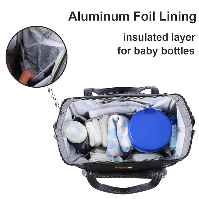 Diaper Bag Tote, with 12 Pocket Mom Bag, 16" Large Leather Baby Bags Convenient to Carry Diapers, Wet Wipes, and Bottles (Black)