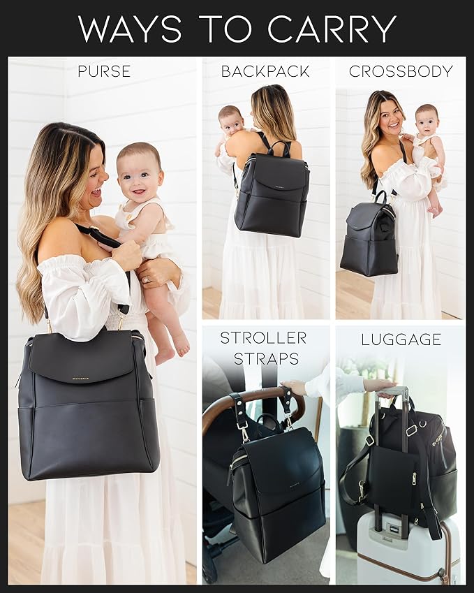 - STYLE & FUNCTION COMBINED - Designed for modern parents, this luxury diaper bag combines a sleek designer diaper bag look with everyday practicality. Includes a matching changing pad, an insulated bottle holder, two stroller straps, and an adjustable shoulder strap—wear it as a backpack, crossbody, or purse to suit any occasion.