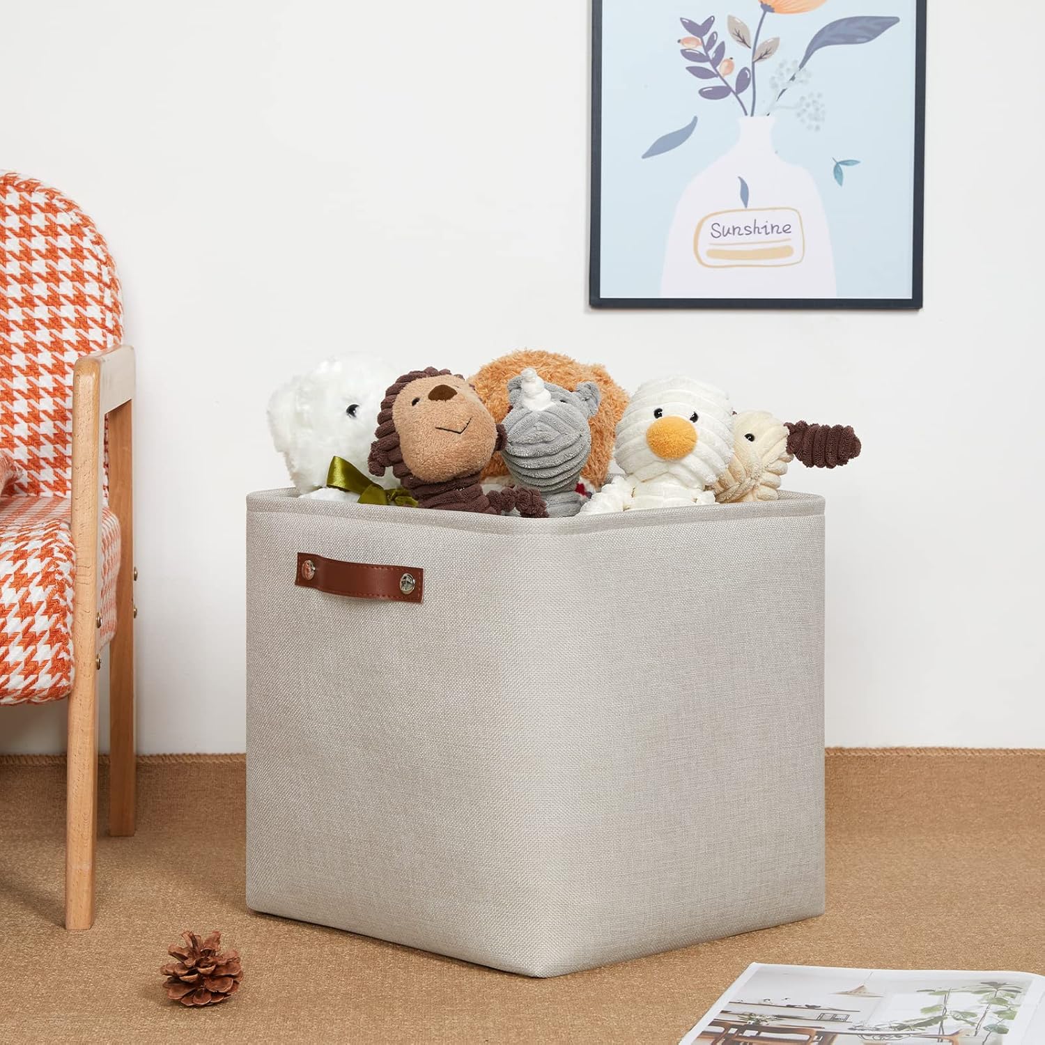 - 【Premium Quality And Leather Handle】The outside of these cube storage baskets are made of EV material and the inside is linen. The EV material makes the whole product more three-dimensional, and the linen closet organizers and storage baskets inner layer is more comfortable. No worry about sturdy issue, there is metal bracket to support it. The basket with leather handle is easy to grab and the quality of construction is very good.