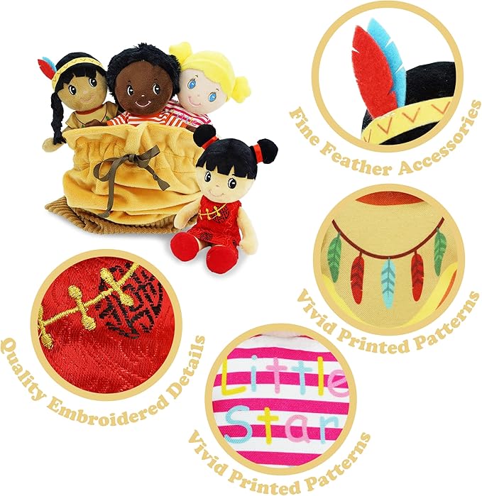 - MULTICULTURAL DOLL SET: Introducing the June Garden Soft Baby Doll Set, featuring 4 diverse 8.5" plush baby dolls representing Native American, Asian, African American, and Caucasian cultures, fostering an early appreciation for diversity.ferent cultures and a convenient toy storage bag.