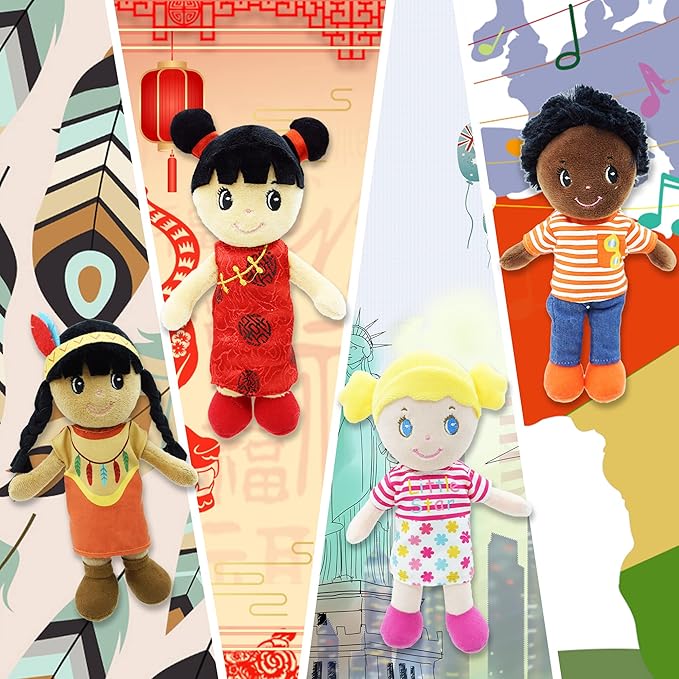 - ADORABLE DESIGN: Each soft and cuddly doll boasts charming embroidered facial features and unique, colorful outfits that showcase their cultural backgrounds, making them both endearing and educational playmates for young children.