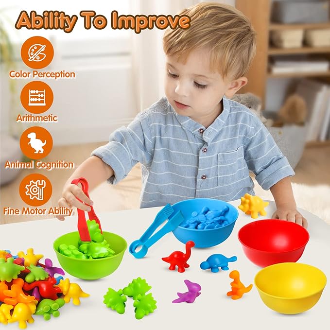 - ❤Fun Learning Tool: This dinosaur counting and matching toy contains 2 tweezers, 6 different colored sorting bowls, and 48 small dinosaur toys. Exquisite shapes and rich colors keep children interested in learning Math.