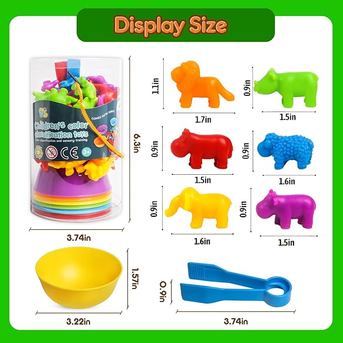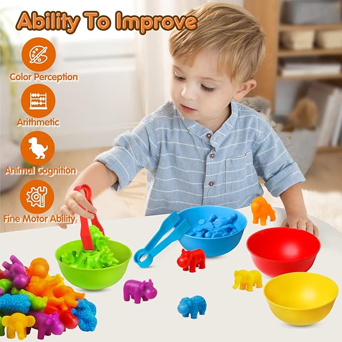 - Fun Learning Tool: This animal counting and matching toy contains 2 tweezers, 6 different colored sorting bowls, and 36 small animal toys. Exquisite shapes and rich colors keep children interested in learning Math.