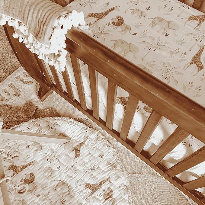 - SAFARI NURSERY: Immerse your baby's nursery in a safari theme nursery decor with our 100% Cotton Sateen fitted crib sheets. Incorporating safari animal nursery decor, these sheets are gentle on your baby's delicate skin, providing a soft and cozy sleeping surface.