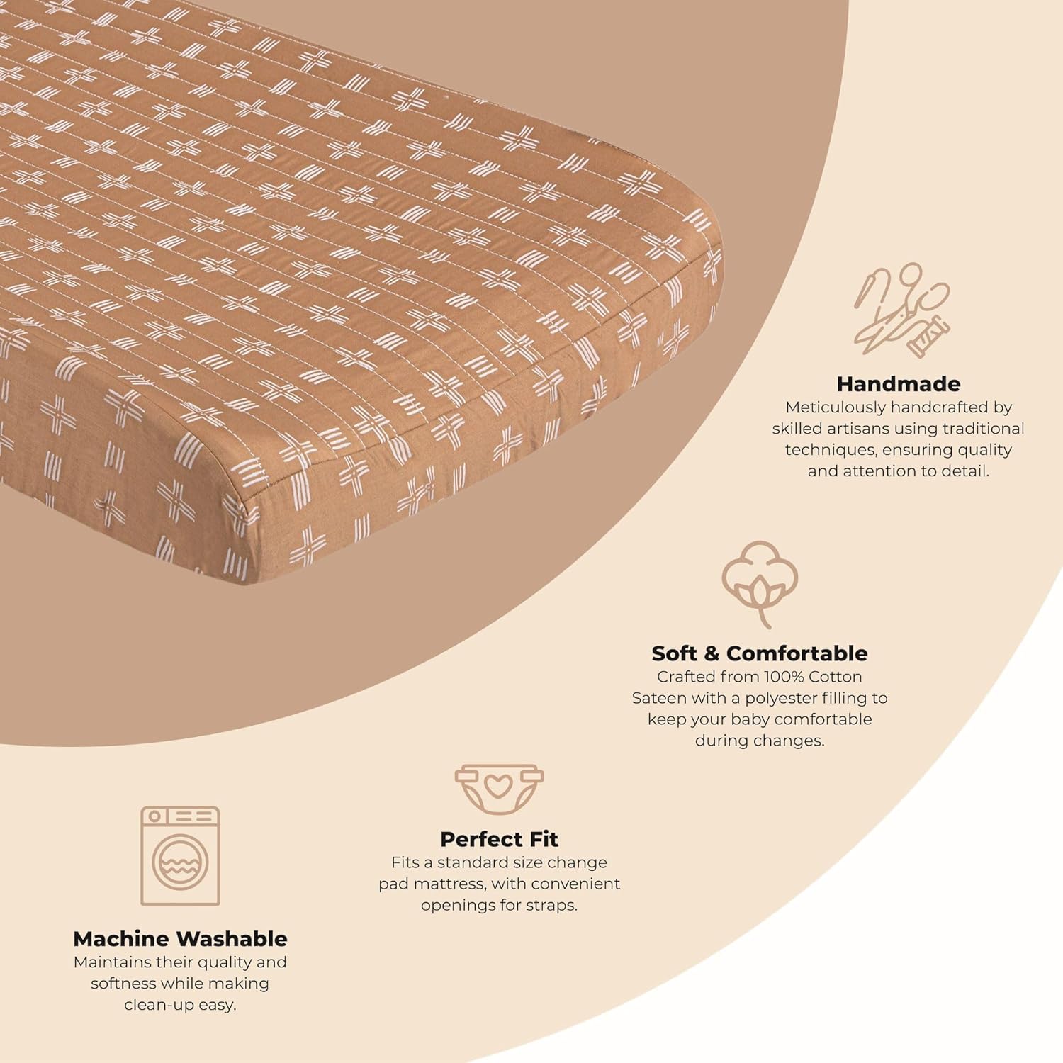 - Size - One 16”w x 32”h quilted changing pad cover in copper dash print
