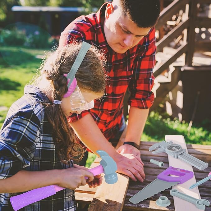 - Kids Tool Set: Children imitate their father in repairing. This pink toy set has 29 pcs of tools in a convenient toolbox. Including hammer, pliers, vernier caliper, screwdriver, hand saw, and 2 in 1 drill (batteries not included), the drill can run on battery power!