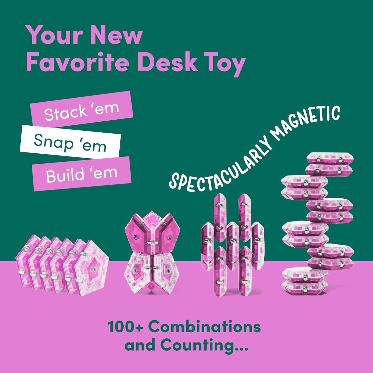 - STACKABLE, SHAKEABLE, SNAPPABLE, BUILDABLE: Use magnetic magic to build gravity defying structures then use your hand as a hammer to mess up your masterpiece. Have a jumble of pieces? Pile them into your palms and shake vigorously. They’ll magically self-align every time!