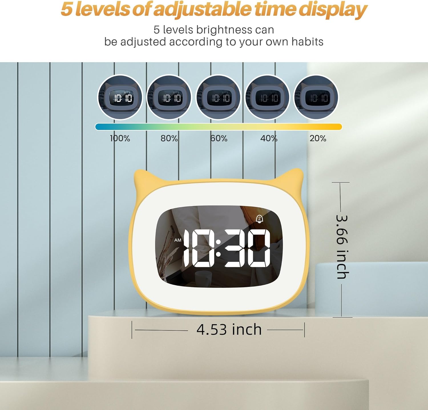 Kids Alarm Clock with Night Light & 18 Ringtones,Rechargeable,Cute Cat Ear Clock for Boys Girls Birthday Presents,Digital Clock for Children's Bedroom(Yellow)