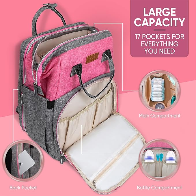 - STAY ORGANIZED AND STRESS-FREE: With 17 thoughtfully designed pockets, our ARIBAGGI Grey Pink Baby Diaper Bag Backpack keeps every diaper, bottle, and toy perfectly organized and within easy reach, making outings with your baby smooth and hassle-free.