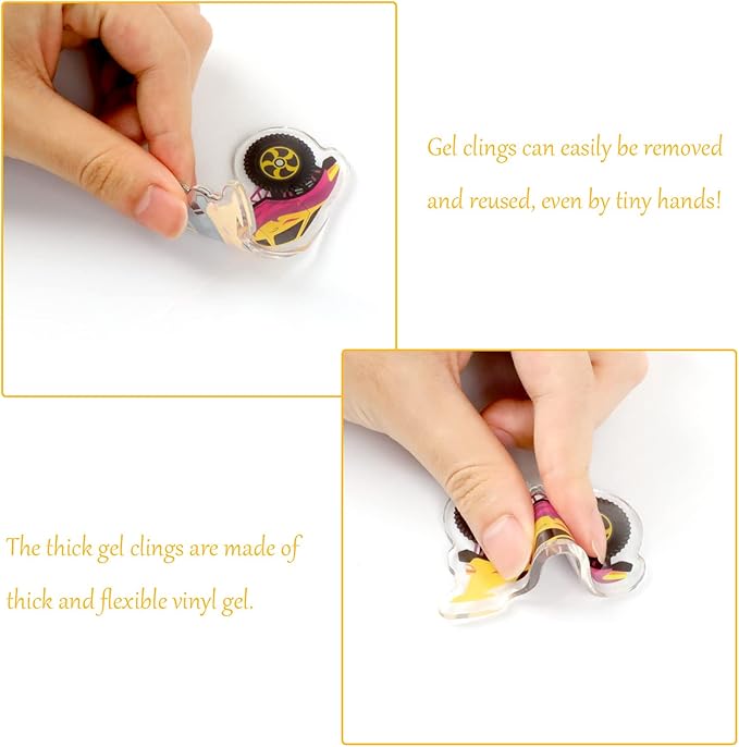 - Note: truck thick gel clings are not edible. These thick gel window clings are suitable for children 5 years and older to play, and there is a risk of suffocation. They need to be accompanied by an adult when playing.