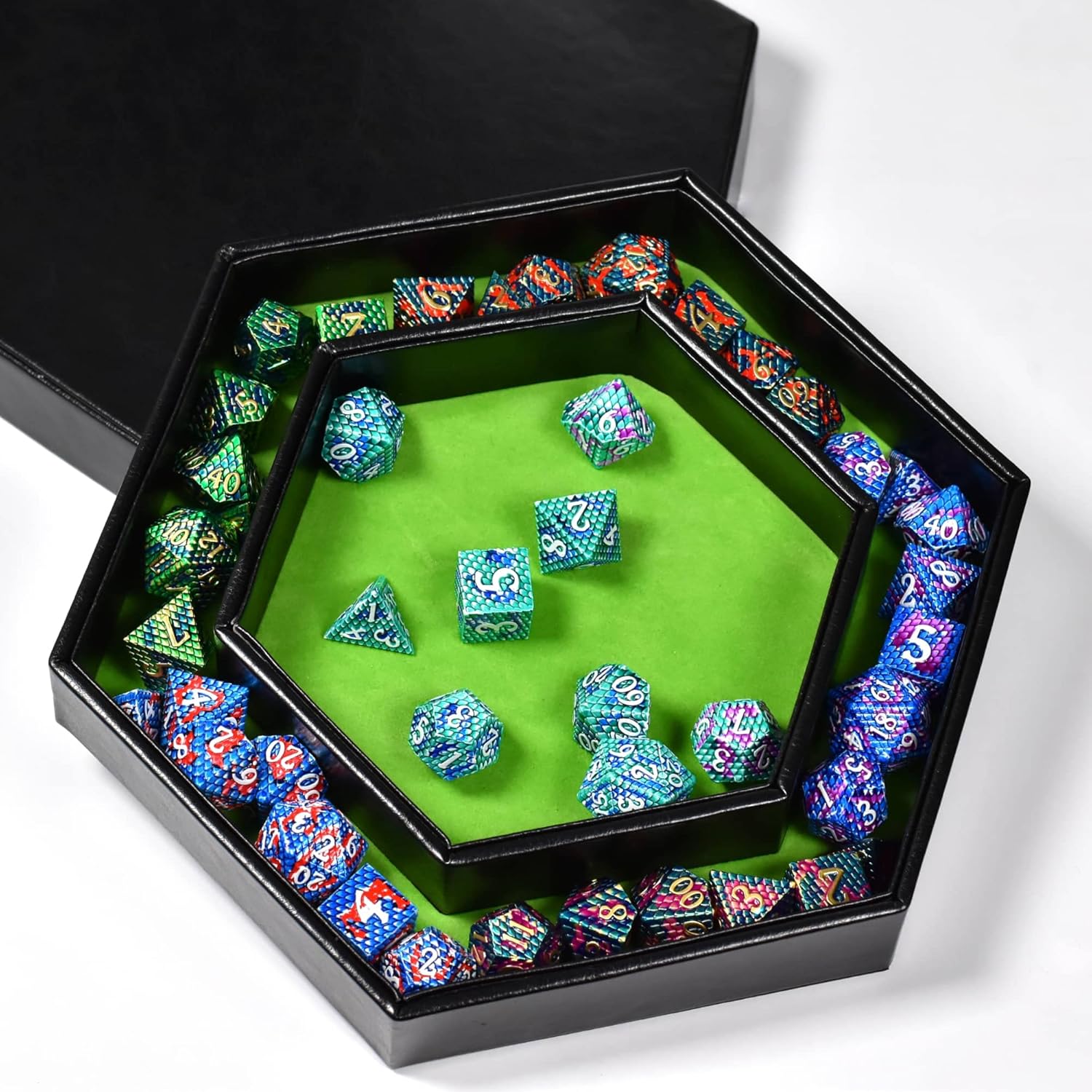 DND Dice Tray - 2 in 1 Hexagonal Rolling and Storage Tray, Faux Leather Material, Green Color, Compatible with D&D, MTG, Dice Arena