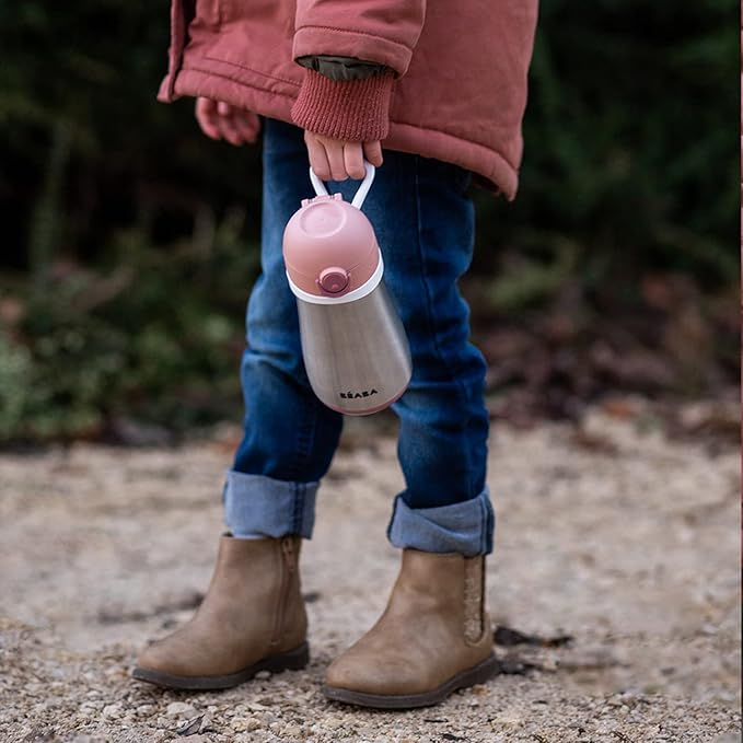 BEABA Kids Stainless Steel Insulated Water Bottle, Kids Water Bottle, Toddler Thermos with Spill Proof Spout and Close Top, Perfect for Travel, (Rose)