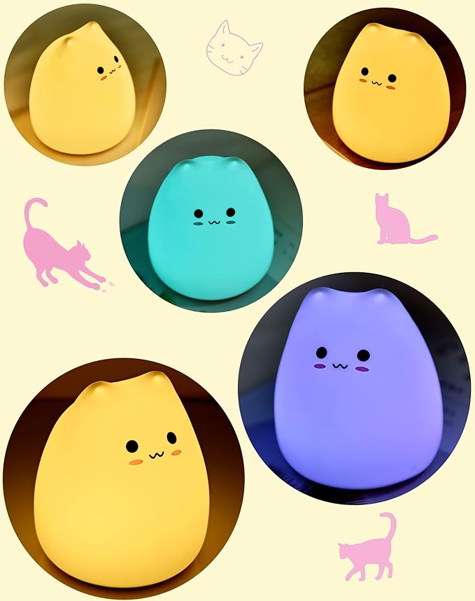 - 3 Night Light Modes: Warm white mode, 7-color breathing mode, single color mode. You can change its mode by patting the silicone surface. Turn on the button, this cat lamp enters warm white light mode, pat the night light, it will enter 7-color breathing mode, pat it again, the light will be fixed in the color you select.