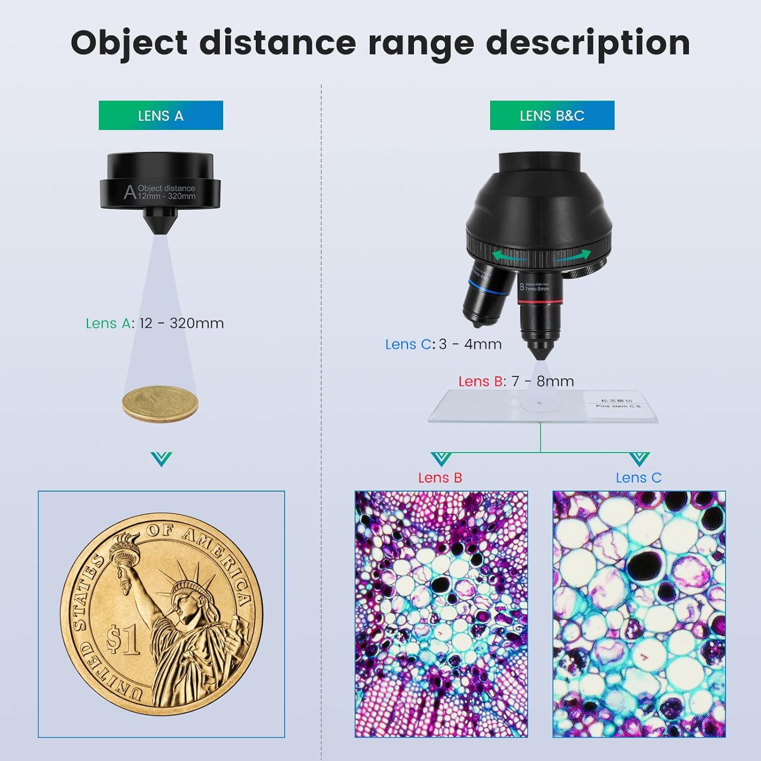 - 【3 Lens Digital Microscope with 18X-2040X Magnification】This multi-Lens digital microscope JL249PS provides a wide magnification range for versatile uses. Lens A (18-720x) can be used to observe coins, stamps, and stones, and do some simple circuit board repairing. Lens B (1560-2040x) and Lens C (2760-4080x) can be used to observe biological slides and study specimens